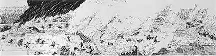 Après avoir refusé la permission aux forces du Shogun de passer paisiblement, les forces de Satsuma ont ouvert le feu sur le flanc. Ce furent les premiers coups de feu de la guerre de Boshin. Un obus de Satsuma a éclaté sur un affût de canon à côté du cheval du commandant shogunal Tomotaka Takigawa, causant sa chute et la fuite de son destrier. Le cheval effrayé a couru si sauvagement que sa panique et son désarroi se sont répercutés sur la colonne shogunale. L'attaque de Satsuma était puissante et elle a rapidement mis en déroute les troupes shogunales.