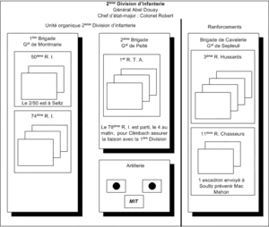 La 2e division d’infanterie est renforcée par la brigade légère de cavalerie de la division de cavalerie du corps d’armée. Au total, le général Douay ne peut compter que sur ses 8 000 hommes, alors qu’une division d’infanterie en comprend normalement 15 000. Ceci est dû à la mauvaise organisation de la mobilisation ; toutes les unités n’ont pas atteint leur effectif de guerre.
