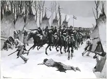 Le matin du , les éclaireurs indiens de George Armstrong Custer repèrent la piste de guerriers amérindiens. Les troupes américaines suivent la piste indienne toute la journée, ne s’arrêtant qu’en fin de soirée pour prendre un peu de repos. Les soldats arrivent finalement en vue du camp (51 tipis) du chef cheyenne Black Kettle. Custer divise alors ses troupes en quatre détachements qui prennent position autour du village amérindien[3]. L’attaque est lancée aux premières lueurs de l’aube.