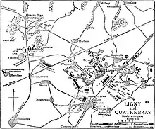 - D'Erlon est venu très proche du champ de bataille de Ligny. Il a été observé par les deux côtés d'une distance, et confondu par tant de « l'avant-garde de Wellington ». Cela a persuadé Gneisenau de prendre sa décision fatidique à engager ses réserves et d'attaquer l'aile gauche française avec toute la force. Mais d'Erlon a arrêté son avance quand il a reçu l'ordre de rappel de Ney ; il a laissé la moitié de son corps avec le général Durutte avec ordre « d'être prudent » ; et il est revenu avec l'autre moitié à Frasnes, où il vient d'arriver juste à temps pour aider Ney de se retirer en bon ordre des Quatre-Bras ; cf. Hamilton-Williams, p. 228-232.