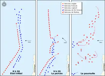 Le 12 avril, Rodney attaque les 30 navires français restant avec ses 36 bâtiments. Par un vent faible d'est-nord-est, les deux flottes alignées sur deux files commencent le combat en allant à la rencontre l'une de l'autre selon la tactique de la ligne de bataille. Les Français ne peuvent pas tirer profit de leur allure au vent car ils sont pris en tenaille entre les Britanniques et la côte ouest de la Dominique. Vers 9 h 20, le vent tourne au sud-est ce qui oblige les Français qui tirent un bord vers le sud à se laisser déporter à tribord vers la file de bâtiments britanniques. Quelques bâtiments français tentent de virer de bord ce qui rompt l'ordre de bataille. Les Britanniques ayant désormais le vent en poupe en profitent et Rodney sur son vaisseau amiral le HMS Formidable, suivi de cinq autres, s'engage dans une brèche entre les navires français. Derrière lui, Hood fait de même et interrompt la ligne française juste devant le Ville de Paris, vaisseau amiral du comte de Grasse.