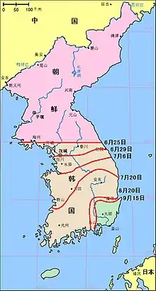 Les forces de l'ONU établissent un périmètre autour de la ville portuaire de Busan tout au long des mois de juillet et août 1950. D'environ 230 km de long, le périmètre s'étend du détroit de Corée à la mer du Japon à l'Ouest et au nord de Busan[29]. Sauf sur les 24 km les plus au sud où elle tourne vers l'Est à l'intérieur du périmètre après sa confluence avec la rivière Nam, l'ouest du périmètre est bordé par le fleuve Nakdong qui forme un coude au niveau de la ville de Daegu[30]. La limite nord est une ligne irrégulière qui court à travers les montagnes au-dessus de Waegwan et Andong jusqu'à Yeongdeok[29].