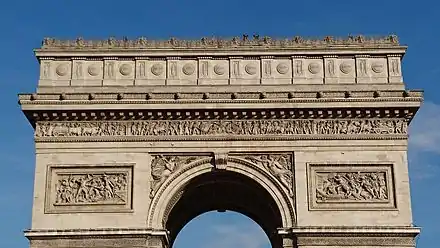 - Sur les quatre faces extérieures du monument, 5 batailles sont représentées en bas-relief (2 face à l'avenue de la Grande-Armée, 1 face à chacune des autres avenues).