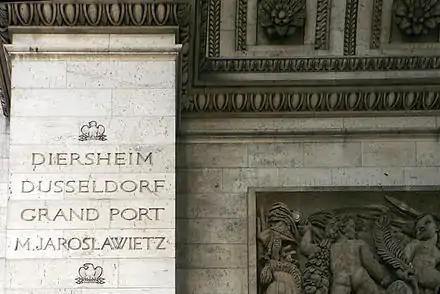 Les batailles de Diersheim, de Düsseldorf, du Grand Port et de Maloïaroslavets gravées sous l'une des petites arcades du monument (face intérieure du pilier nord, colonne de gauche).