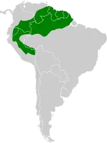 Cet oiseau se rencontre en Bolivie, au Brésil, en Colombie, en Équateur, au Guyana, en Guyane, au Pérou, au Suriname et au Venezuela[1].