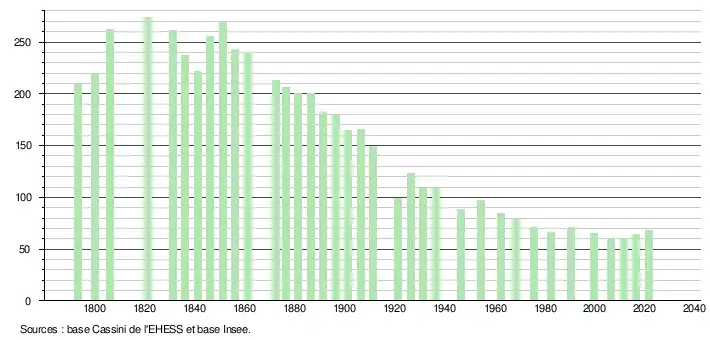 L'évolution du nombre d'habitants est connue à travers les recensements de la population effectués dans la commune depuis 1793. Pour les communes de moins de 10 000 habitants, une enquête de recensement portant sur toute la population est réalisée tous les cinq ans, les populations légales des années intermédiaires étant quant à elles estimées par interpolation ou extrapolation[19]. Pour la commune, le premier recensement exhaustif entrant dans le cadre du nouveau dispositif a été réalisé en 2006[20].