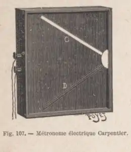 Le « batteur de mesure ou métronome électrique » de Duboscq, de 1869, est « formé d'un fléau de balance sur les bras duquel agissent alternativement deux électro-aimants, et dont l'aiguille centrale très courte attire l'extrémité inférieure de la vergette du métronome qui s'incline dans un sens ou dans l'autre, suivant que le courant agit sur le premier ou le second électro-aimant[13] ».