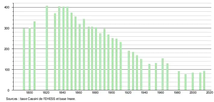 - Dans le tableau des recensements et le graphique, par convention dans Wikipédia, le principe a été retenu, pour les populations légales postérieures à 1999 de n’afficher dans le tableau des recensements et le graphique que les populations correspondant à l'année 2006, première population légale publiée calculée conformément aux concepts définis dans le décret no 2003-485 du 5 juin 2003, et les années correspondant à une enquête exhaustive de recensement pour les communes de moins de 10 000 habitants, ainsi que la dernière population légale publiée par l’Insee.