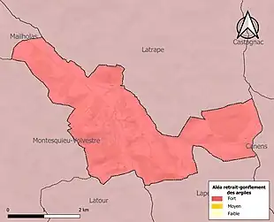 Le retrait-gonflement des sols argileux est susceptible d'engendrer des dommages importants aux bâtiments en cas d’alternance de périodes de sécheresse et de pluie. La totalité de la commune est en aléa moyen ou fort (88,8 % au niveau départemental et 48,5 % au niveau national). Sur les 43 bâtiments dénombrés sur la commune en 2019, 43 sont en aléa moyen ou fort, soit 100 %, à comparer aux 98 % au niveau départemental et 54 % au niveau national. Une cartographie de l'exposition du territoire national au retrait gonflement des sols argileux est disponible sur le site du BRGM[27],[Carte 3].