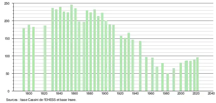 L'évolution du nombre d'habitants est connue à travers les recensements de la population effectués dans la commune depuis 1793. Pour les communes de moins de 10 000 habitants, une enquête de recensement portant sur toute la population est réalisée tous les cinq ans, les populations légales des années intermédiaires étant quant à elles estimées par interpolation ou extrapolation[31]. Pour la commune, le premier recensement exhaustif entrant dans le cadre du nouveau dispositif a été réalisé en 2007[32].