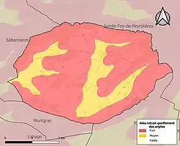 Le retrait-gonflement des sols argileux est susceptible d'engendrer des dommages importants aux bâtiments en cas d’alternance de périodes de sécheresse et de pluie. La totalité de la commune est en aléa moyen ou fort (88,8 % au niveau départemental et 48,5 % au niveau national). Sur les 169 bâtiments dénombrés sur la commune en 2019, 169 sont en aléa moyen ou fort, soit 100 %, à comparer aux 98 % au niveau départemental et 54 % au niveau national. Une cartographie de l'exposition du territoire national au retrait gonflement des sols argileux est disponible sur le site du BRGM[25],[Carte 3].