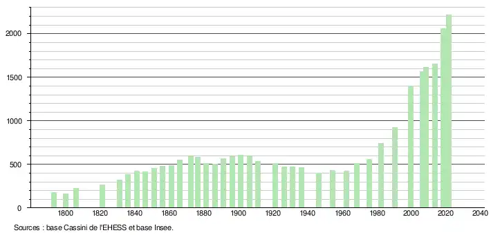 L'évolution du nombre d'habitants est connue à travers les recensements de la population effectués dans la commune depuis 1793. Pour les communes de moins de 10 000 habitants, une enquête de recensement portant sur toute la population est réalisée tous les cinq ans, les populations légales des années intermédiaires étant quant à elles estimées par interpolation ou extrapolation[28]. Pour la commune, le premier recensement exhaustif entrant dans le cadre du nouveau dispositif a été réalisé en 2008[29].