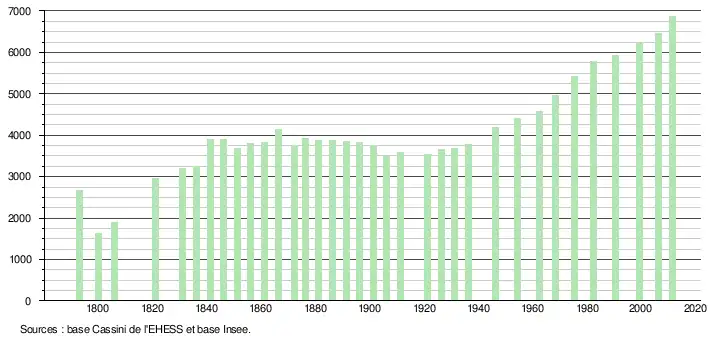 L'évolution du nombre d'habitants est connue à travers les recensements de la population effectués dans la commune depuis 1793. À partir du , les populations légales des communes sont publiées annuellement dans le cadre d'un recensement qui repose désormais sur une collecte d'information annuelle, concernant successivement tous les territoires communaux au cours d'une période de cinq ans. Pour les communes de moins de 10 000 habitants, une enquête de recensement portant sur toute la population est réalisée tous les cinq ans, les populations légales des années intermédiaires étant quant à elles estimées par interpolation ou extrapolation[33]. Pour la commune, le premier recensement exhaustif entrant dans le cadre du nouveau dispositif a été réalisé en 2006[34],[Note 2].
