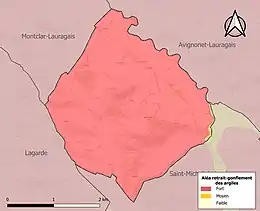 Le retrait-gonflement des sols argileux est susceptible d'engendrer des dommages importants aux bâtiments en cas d’alternance de périodes de sécheresse et de pluie. La totalité de la commune est en aléa moyen ou fort (88,8 % au niveau départemental et 48,5 % au niveau national). Sur les 81 bâtiments dénombrés sur la commune en 2019, 81 sont en aléa moyen ou fort, soit 100 %, à comparer aux 98 % au niveau départemental et 54 % au niveau national. Une cartographie de l'exposition du territoire national au retrait gonflement des sols argileux est disponible sur le site du BRGM[26],[Carte 3].