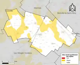 Le retrait-gonflement des sols argileux est susceptible d'engendrer des dommages importants aux bâtiments en cas d’alternance de périodes de sécheresse et de pluie. 35,8 % de la superficie communale est en aléa moyen ou fort (52,8 % au niveau départemental et 48,5 % au niveau national). Sur les 156 bâtiments dénombrés sur la commune en 2019, 37 sont en aléa moyen ou fort, soit 24 %, à comparer aux 70 % au niveau départemental et 54 % au niveau national. Une cartographie de l'exposition du territoire national au retrait gonflement des sols argileux est disponible sur le site du BRGM[20],[Carte 2].