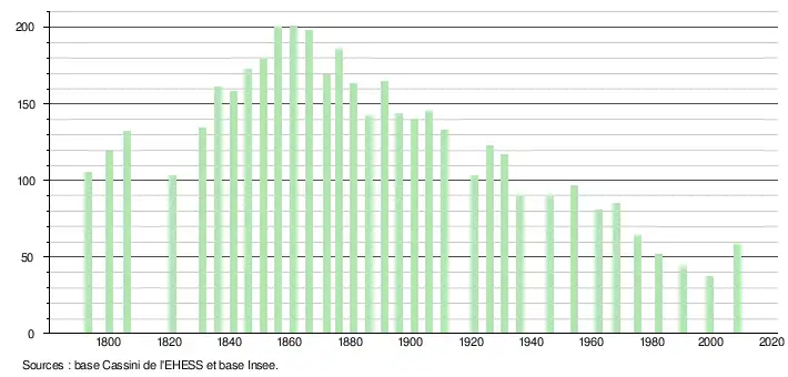 L'évolution du nombre d'habitants est connue à travers les recensements de la population effectués dans la commune depuis 1793. À partir du , les populations légales des communes sont publiées annuellement dans le cadre d'un recensement qui repose désormais sur une collecte d'information annuelle, concernant successivement tous les territoires communaux au cours d'une période de cinq ans. Pour les communes de moins de 10 000 habitants, une enquête de recensement portant sur toute la population est réalisée tous les cinq ans, les populations légales des années intermédiaires étant quant à elles estimées par interpolation ou extrapolation[3]. Pour la commune, le premier recensement exhaustif entrant dans le cadre du nouveau dispositif a été réalisé en 2008[4],[Note 1].