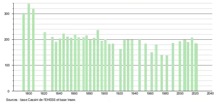 L'évolution du nombre d'habitants est connue à travers les recensements de la population effectués dans la commune depuis 1793. Pour les communes de moins de 10 000 habitants, une enquête de recensement portant sur toute la population est réalisée tous les cinq ans, les populations légales des années intermédiaires étant quant à elles estimées par interpolation ou extrapolation[44]. Pour la commune, le premier recensement exhaustif entrant dans le cadre du nouveau dispositif a été réalisé en 2005[45].