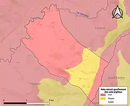 Le retrait-gonflement des sols argileux est susceptible d'engendrer des dommages importants aux bâtiments en cas d’alternance de périodes de sécheresse et de pluie. La totalité de la commune est en aléa moyen ou fort (92 % au niveau départemental et 48,5 % au niveau national). Sur les 59 bâtiments dénombrés sur la commune en 2019, 59 sont en aléa moyen ou fort, soit 100 %, à comparer aux 96 % au niveau départemental et 54 % au niveau national. Une cartographie de l'exposition du territoire national au retrait gonflement des sols argileux est disponible sur le site du BRGM[25],[Carte 3].