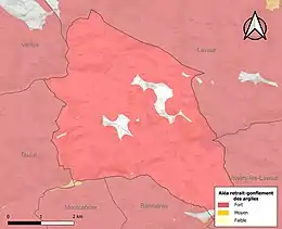 La commune est vulnérable au risque de mouvements de terrains constitué principalement du retrait-gonflement des sols argileux[24]. Cet aléa est susceptible d'engendrer des dommages importants aux bâtiments en cas d’alternance de périodes de sécheresse et de pluie. 95,3 % de la superficie communale est en aléa moyen ou fort (76,3 % au niveau départemental et 48,5 % au niveau national). Sur les 100 bâtiments dénombrés sur la commune en 2019, 97 sont en aléa moyen ou fort, soit 97 %, à comparer aux 90 % au niveau départemental et 54 % au niveau national. Une cartographie de l'exposition du territoire national au retrait gonflement des sols argileux est disponible sur le site du BRGM[25],[Carte 3].