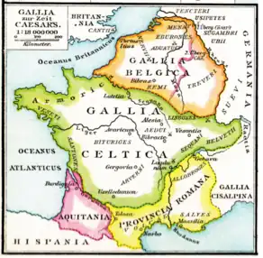 La province romaine de Gallia Belgica du début de la période impériale correspondait pratiquement à l'ensemble des cités de l'ancienne fédération belge, c'est-à-dire les territoires sis entre le Rhin et la Seine, qu'il ne faut pas confondre avec le territoire auquel César donnait le nom de Belgium[23], partie de la Gaule belgique située entre l'Oise et l'Escaut. Au départ, la capitale de la grande province est Durocortorum (Reims) puis, à une date indéterminée (mais probablement pas avant la fin du Haut-Empire), la capitale est transférée à Augusta Treverorum (Trèves).