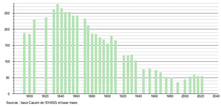 L'évolution du nombre d'habitants est connue à travers les recensements de la population effectués dans la commune depuis 1793. Pour les communes de moins de 10 000 habitants, une enquête de recensement portant sur toute la population est réalisée tous les cinq ans, les populations légales des années intermédiaires étant quant à elles estimées par interpolation ou extrapolation[18]. Pour la commune, le premier recensement exhaustif entrant dans le cadre du nouveau dispositif a été réalisé en 2006[19].