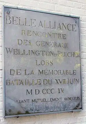 Néanmoins, ce bâtiment sans aucune importance acquit une célébrité universelle : c’est à cet endroit que Blücher et Wellington se rencontrèrent au soir de la bataille. C’est du moins ce que racontent les auteurs[Lesquels ?] et ce que semble confirmer la plaque en marbre blanc que l’on apposa au-dessus de la porte du cabaret : « BELLE-ALLIANCE / RENCONTRE / DES GENERAUX / WELLINGTON ET BLÜCHER / LORS / DE LA MEMORABLE / BATAILLE DU XVIII JUIN / MDCCCXV / SE SALUANT MUTUELLEMENT VAINQUEURS ». Cette plaque, usée par le temps, a été remplacée et se trouve actuellement au Musée du Caillou.