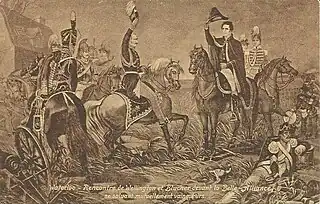 « Le duc… resta quelque temps avec ses troupes avancées sur la droite de Rossomme, à converser avec le général Vivian, le colonel Colborne et d’autres ; après quoi, ayant promis d’envoyer les provisions, Sa Grâce fit faire demi-tour à son cheval et s’en alla. En retournant à son aise vers Waterloo, vers dix heures, il aperçut un peu avant d’arriver à la Belle Alliance à l’aide d’une lune un peu obscure, un groupe d’officiers montés qui, venant du côté de Frischermont, se dirigeait vers la grand’route de Genappe ; le duc se détourna pour les rejoindre, il se trouva que c’étaient Blücher et son état-major ; ils se complimentèrent mutuellement de la façon la plus cordiale, du glorieux résultat de la lutte, dans laquelle ils avaient été engagés. L’entretien avait duré environ dix minutes, lorsque le vétéran Blücher, après avoir promis de ne pas laisser à son ennemi invétéré le temps de se rallier de ce côté-ci de ses frontières, échangea une poignée de main avec Sa Grâce et partit pour Genappe, ayant envoyé au général Gneisenau, qui commandait l’avant-garde, l’ordre de presser et de harceler l’ennemi, et ne pas laisser l’herbe croître sous ses pieds, ni de lui permettre même de reprendre haleine[3]. »