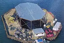Le chantier de fouille, qui entourait l'épave, avait une enceinte de 25 mètres sur 16. Un auvent protégeait le site des intempéries. Les deux parois de cette enceinte se trouvaient à une distance de 10 mètres l'une de l'autre. Dans l'espace entre ces parois, l'équipe avait aménagé un surplomb qui accueillait une grue pour soulever les pièces lourdes extraites du site, d'autres matériels de fouille, ainsi que les bureaux et les logements des archéologues.