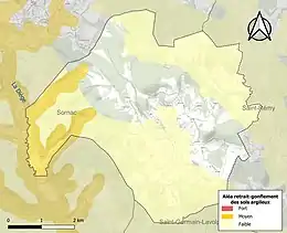 Le retrait-gonflement des sols argileux est susceptible d'engendrer des dommages importants aux bâtiments en cas d’alternance de périodes de sécheresse et de pluie. 9,7 % de la superficie communale est en aléa moyen ou fort (26,8 % au niveau départemental et 48,5 % au niveau national). Sur les 68 bâtiments dénombrés sur la commune en 2019, aucun n'est en aléa moyen ou fort, à comparer aux 36 % au niveau départemental et 54 % au niveau national. Une cartographie de l'exposition du territoire national au retrait gonflement des sols argileux est disponible sur le site du BRGM[18],[Carte 2].