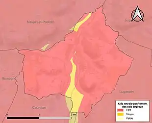 Le retrait-gonflement des sols argileux est susceptible d'engendrer des dommages importants aux bâtiments en cas d’alternance de périodes de sécheresse et de pluie. La totalité de la commune est en aléa moyen ou fort (67,4 % au niveau départemental et 48,5 % au niveau national). Sur les 129 bâtiments dénombrés sur la commune en 2019, 129 sont en aléa moyen ou fort, soit 100 %, à comparer aux 84 % au niveau départemental et 54 % au niveau national. Une cartographie de l'exposition du territoire national au retrait gonflement des sols argileux est disponible sur le site du BRGM[22],[Carte 2].