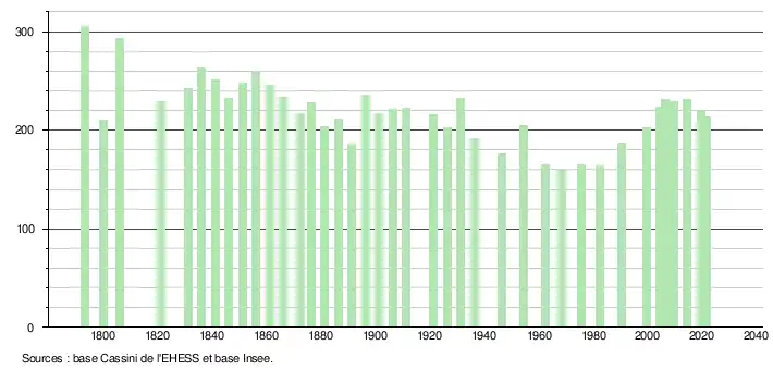 L'évolution du nombre d'habitants est connue à travers les recensements de la population effectués dans la commune depuis 1793. Pour les communes de moins de 10 000 habitants, une enquête de recensement portant sur toute la population est réalisée tous les cinq ans, les populations légales des années intermédiaires étant quant à elles estimées par interpolation ou extrapolation[26]. Pour la commune, le premier recensement exhaustif entrant dans le cadre du nouveau dispositif a été réalisé en 2004[27].