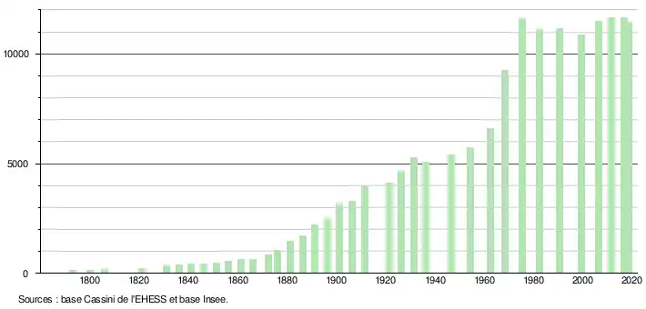 - Par convention dans Wikipédia, le principe a été retenu de n’afficher dans le tableau des recensements et le graphique, pour les populations légales postérieures à 1999, que les populations correspondant à une enquête exhaustive de recensement pour les communes de moins de 10 000 habitants, et que les populations des années 2006, 2011, 2016, etc. pour les communes de plus de 10 000 habitants, ainsi que la dernière population légale publiée par l’Insee pour l'ensemble des communes.