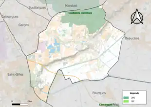 et une ZNIEFF de type 2[Note 3],[13] : le « Camargue gardoise » (42 422 ha), couvrant 12 communes dont 11 dans le Gard et 1 dans l'Hérault[18].