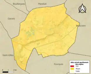 La commune est vulnérable au risque de mouvements de terrains constitué principalement du retrait-gonflement des sols argileux[28]. Cet aléa est susceptible d'engendrer des dommages importants aux bâtiments en cas d’alternance de périodes de sécheresse et de pluie. La totalité de la commune est en aléa moyen ou fort (67,5 % au niveau départemental et 48,5 % au niveau national). Sur les 2 550 bâtiments dénombrés sur la commune en 2019, 2550 sont en aléa moyen ou fort, soit 100 %, à comparer aux 90 % au niveau départemental et 54 % au niveau national. Une cartographie de l'exposition du territoire national au retrait gonflement des sols argileux est disponible sur le site du BRGM[29],[Carte 2].