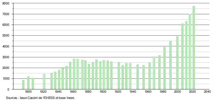 - Population municipale légale en vigueur au 1er janvier 2024, millésimée 2021, définie dans les limites territoriales en vigueur au 1er janvier 2023, date de référence statistique : 1er janvier 2021.