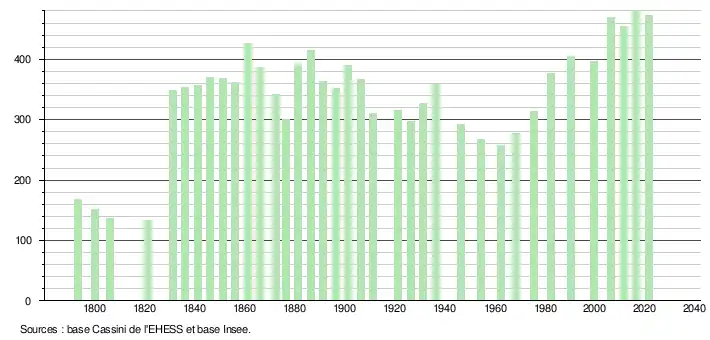 L'évolution du nombre d'habitants est connue à travers les recensements de la population effectués dans la commune depuis 1793. Pour les communes de moins de 10 000 habitants, une enquête de recensement portant sur toute la population est réalisée tous les cinq ans, les populations légales des années intermédiaires étant quant à elles estimées par interpolation ou extrapolation[21]. Pour la commune, le premier recensement exhaustif entrant dans le cadre du nouveau dispositif a été réalisé en 2006[22].