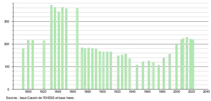 L'évolution du nombre d'habitants est connue à travers les recensements de la population effectués dans la commune depuis 1793. Pour les communes de moins de 10 000 habitants, une enquête de recensement portant sur toute la population est réalisée tous les cinq ans, les populations légales des années intermédiaires étant quant à elles estimées par interpolation ou extrapolation[20]. Pour la commune, le premier recensement exhaustif entrant dans le cadre du nouveau dispositif a été réalisé en 2008[21].
