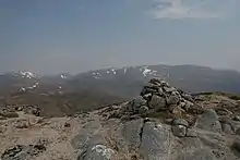 Vue du cairn au sommet du Ben Alder avec le Sgòr Gaibhre au dernier plan.