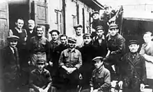 Benedykt Kraskowski (premier à gauche) avec des Juifs du ghetto:Mojsze Lichtenbojm, Dzili Kajdenbaum, Jankel Brodacz, Icchak Kaner, Josef Edelsztajn, Szimszon Esztman, Mojsze Kajdenbaum, Zilia Gutenberg et Hirsz Szulman , Cuker, Aszer Kajdenbaum et Jehoszua Kajdenbaum