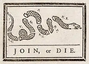 Le Join, or Die, dessin prônant l'Union des colonies attribué à Benjamin Franklin. - 1751 : il est élu membre de l’Assemblée de Pennsylvanie.