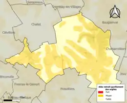 Le retrait-gonflement des sols argileux est susceptible d'engendrer des dommages importants aux bâtiments en cas d’alternance de périodes de sécheresse et de pluie. 63,1 % de la superficie communale est en aléa moyen ou fort (52,8 % au niveau départemental et 48,5 % au niveau national). Sur les 355 bâtiments dénombrés sur la commune en 2019, 352 sont en aléa moyen ou fort, soit 99 %, à comparer aux 70 % au niveau départemental et 54 % au niveau national. Une cartographie de l'exposition du territoire national au retrait gonflement des sols argileux est disponible sur le site du BRGM[16],[Carte 2].