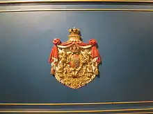 La couleur de base du wagon est le bleu royal. À cela s'ajoutent des décorations dorées en bois et en bronze, des bandes, des guirlandes, des figures décoratives et des éléments héraldiques qui sont placés sur le dessus. Sur le toit se trouve la couronne royale, qui mesure environ 50 centimètres de haut. Les somptueuses guirlandes de fleurs au-dessus des fenêtres et les putti sont typiques du style Louis-quatorze. Des lys stylisés, plante héraldique de la famille royale française, fait référence à Louis XIV [22]. Sous les fenêtres, au milieu du wagon, les armoiries royales étaient placées, dans les champs à droite et à gauche de celle-ci le monogramme du roi, dans une couronne de feuilles de chêne et de laurier.