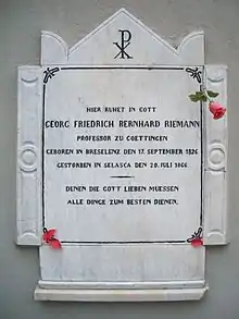 En , il épouse Elise Koch, une amie proche de ses sœurs. En , il contracte une pleurite qui évolue rapidement en tuberculose. Sa santé ne s'améliorant pas avec le temps, il se rend avant l'hiver en Italie où il recouvre quelque peu la santé. En , il retourne à Göttingen pour y reprendre ses devoirs académiques mais il est contraint de repartir quelques mois plus tard dans la péninsule italienne. Durant ce nouveau séjour méditerranéen, naît sa fille Ida. Deux ans plus tard, en , Riemann revient pour la dernière fois de sa vie à Göttingen. Il se réunit avec quelques-uns de ses collègues et met de l'ordre dans ses affaires avant de retourner en Italie. Il quitte Göttingen avant que les armées de Hanovre et de Prusse s'affrontent en 1866[12]. Il meurt de tuberculose en Italie, à Selasca (aujourd'hui un hameau de Verbania sur le lac Majeur), où il est enterré au cimetière de Biganzolo (Verbania).