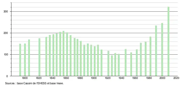 L'évolution du nombre d'habitants est connue à travers les recensements de la population effectués dans la commune depuis 1793. À partir du , les populations légales des communes sont publiées annuellement dans le cadre d'un recensement qui repose désormais sur une collecte d'information annuelle, concernant successivement tous les territoires communaux au cours d'une période de cinq ans. Pour les communes de moins de 10 000 habitants, une enquête de recensement portant sur toute la population est réalisée tous les cinq ans, les populations légales des années intermédiaires étant quant à elles estimées par interpolation ou extrapolation[7]. Pour la commune, le premier recensement exhaustif entrant dans le cadre du nouveau dispositif a été réalisé en 2008[8],[Note 1].