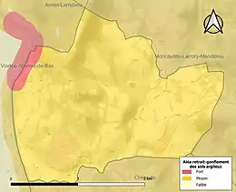 Le retrait-gonflement des sols argileux est susceptible d'engendrer des dommages importants aux bâtiments en cas d’alternance de périodes de sécheresse et de pluie[42]. La totalité de la commune est en aléa moyen ou fort (59 % au niveau départemental et 48,5 % au niveau national)[Carte 5]. Depuis le , en application de la loi ELAN, différentes contraintes s'imposent aux vendeurs, maîtres d'ouvrages ou constructeurs de biens situés dans une zone classée en aléa moyen ou fort[Note 8],[43].