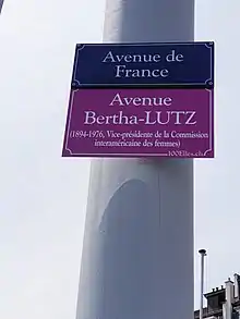 En 2018 l'association Escouade fait poser des plaques de rue temporaires. L'avenue de France à Genève, avenue proche des Nations unies où se situe le Haut Commissariat des Nations unies pour les réfugiés, est renommée temporairement avenue Bertha Lutz dans le cadre de l'initiative 100elles.ch[18].