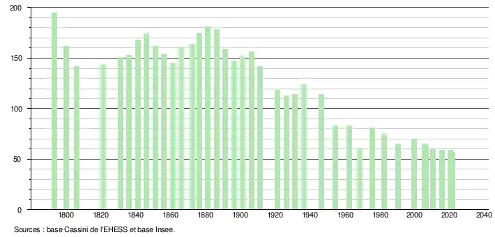 L'évolution du nombre d'habitants est connue à travers les recensements de la population effectués dans la commune depuis 1793. Pour les communes de moins de 10 000 habitants, une enquête de recensement portant sur toute la population est réalisée tous les cinq ans, les populations légales des années intermédiaires étant quant à elles estimées par interpolation ou extrapolation[14]. Pour la commune, le premier recensement exhaustif entrant dans le cadre du nouveau dispositif a été réalisé en 2005[15].