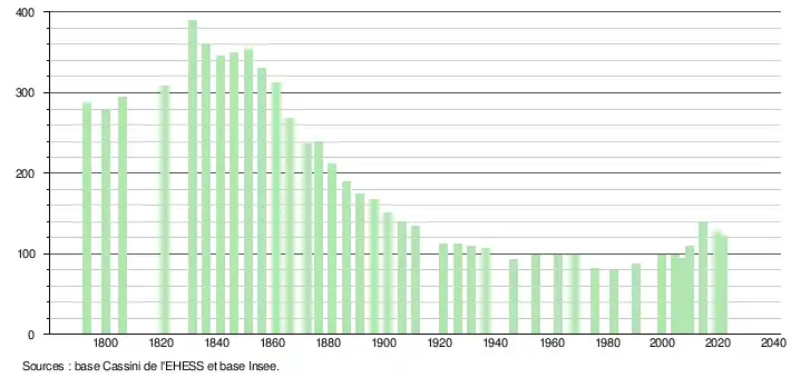 L'évolution du nombre d'habitants est connue à travers les recensements de la population effectués dans la commune depuis 1793. Pour les communes de moins de 10 000 habitants, une enquête de recensement portant sur toute la population est réalisée tous les cinq ans, les populations légales des années intermédiaires étant quant à elles estimées par interpolation ou extrapolation[12]. Pour la commune, le premier recensement exhaustif entrant dans le cadre du nouveau dispositif a été réalisé en 2004[13].