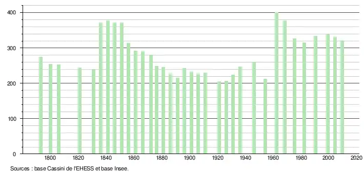 L'évolution du nombre d'habitants est connue à travers les recensements de la population effectués dans la commune depuis 1793. À partir du , les populations légales des communes sont publiées annuellement dans le cadre d'un recensement qui repose désormais sur une collecte d'information annuelle, concernant successivement tous les territoires communaux au cours d'une période de cinq ans. Pour les communes de moins de 10 000 habitants, une enquête de recensement portant sur toute la population est réalisée tous les cinq ans, les populations légales des années intermédiaires étant quant à elles estimées par interpolation ou extrapolation[5]. Pour la commune, le premier recensement exhaustif entrant dans le cadre du nouveau dispositif a été réalisé en 2004[6],[Note 2].