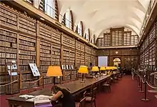 La bibliothèque est constituée de trois salles, dont une est accessible au public[1]. Les boiseries, rayonnages et tables de lecture sont en noyer[1].
